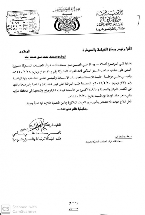 الجدير ذكره أن مركز سلمان للإغاثة والاعمال الانسانية قام مؤخرا باعتماد دعم القطاع الزراعي اليمني بكمية كبيرة من السماد، ووصلت الى مدينة مأرب ثمانية واربعين سيارة نقل كبير "قاطرة" تحمل كمية تقدر بـ 75000 كيس أي 3750 طن من سماد اليورياء.