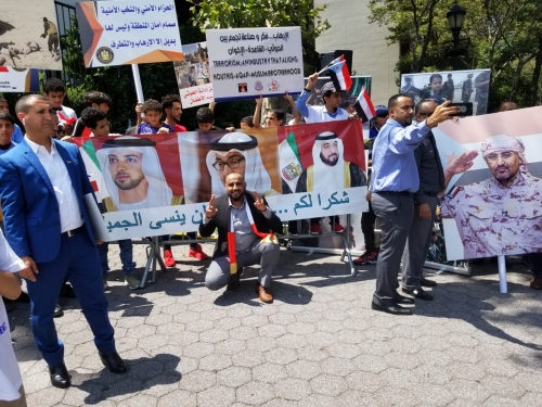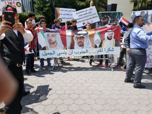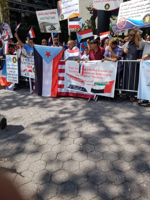 تظاهرت أعداد غفيرة من ابناء الجنوب اليوم الخميس في الولايات المتحدة الأمريكية أمام مبنى الأمم المتحدة للمطالبة باشراك المجلس الانتقالي في أي مفاوضات تتعلق بالمشكلة في اليمن باعتباره المفوض شعبياً لتمثيل الجنوب.