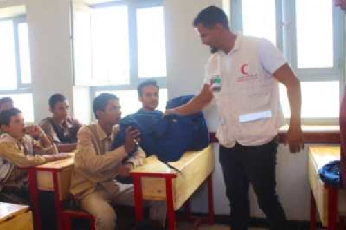 وعبر الطلاب عن شكرهم وتقديرهم للهلال الاحمر الاماراتي على توفيره الكراسي لمدرستهم .