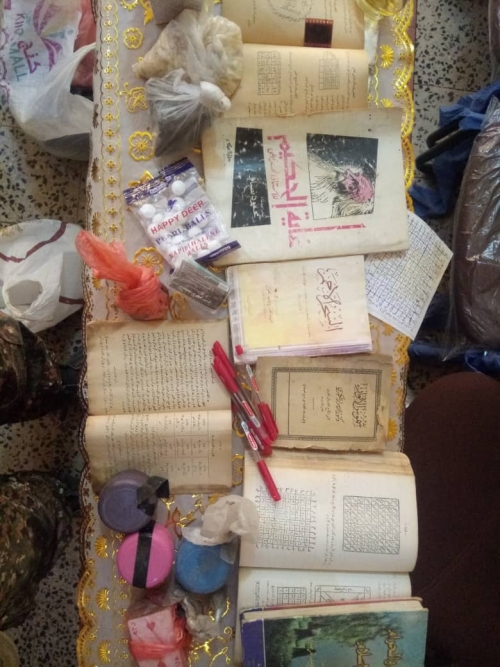 وأضاف المصدر، أنه تم العثور على عدة كتب وطلاسم سحرية ومواد عديدة متنوعة تستخدم في أعمال السحر والشعوذة مع المتهم ، بالإضافة إلى صور لبعض المواطنين مع وثائق شخصية لهم .