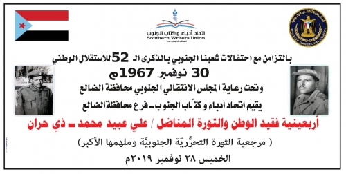 احتضنت قاعة سينما النصر في الضالع صباح اليوم الخميس 28 نوفمبر2019 حفل تأبين فقيد الوطن والثورة المناضل الوطني الجسورعلي عبيد محمد ذي حران " مرجعية الثورة التحررية الجنوبية وملهمها الاكبر ..في اليوم الأربعين من رحيله رحمة الله عليه..والذي ينظمه اتحاد أدباء وكتاب الجنوب فرع محافظة الضالع تحت رعاية المجلس الانتقالي الجنوبي بالضالع..حيث تأتي هذه المناسبة بالتزامن مع احتفالات شعبنا في الجنوب بالذكرى 52للاستقلال الوطني المجيد 1967م