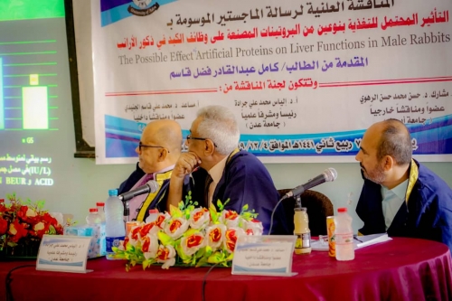 كما استمع الجعدي للمناقشة العلمية والعلنية التي قدمها الطالب كامل عبدالقادر في رسالة الماجستير الموسومة ب : التأثير المحتمل للتغذية بنوعين من البروتينات المصنعة على وظائف الكبد في ذكور الارانب..