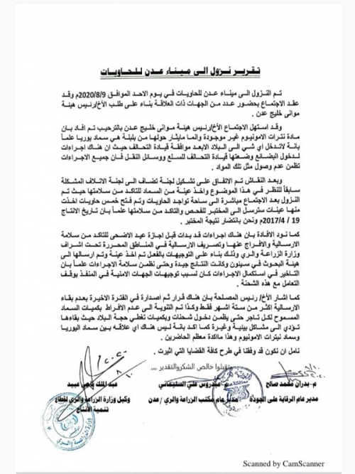 اصدرت لجنة الفحص الخاصة بمعاينة حاويات ميناء عدن والتأكد من مزاعم وجود كميات من نترات الامونيوم في ارصفة الميناء مخزنة منذ ثلاث سنوات، تقريرا اوليا باجراءات نزولها الميداني.