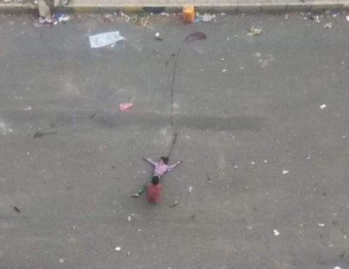 ويظهر في صورة " طفل أخر يحاول سحب جثة الطفلة على قارعة الطريق.