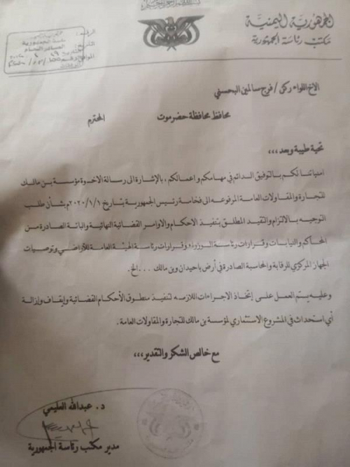 "بالتوجيه بالالتزام والتقيد المطلق بتنفيذ ما وصفها ب"الاحكام والاوامر القضائية النهائية والباتة" الصادرة من المحاكم والنيابات وقرارات رئاسة الوزراء وقرارات رئاسة الهيئة العامة للاراضي وتوصيات الجهاز المركزي للرقابة والمحاسبة في ما اعتبرها ب"ارض باحيدان وبن مالك ..الخ"، بينما القضية ماتزال منظورة أمام محكمة غرب المكلا حسب إفادة وتأكيد قاضي المحكمة في مذكرته المرفقة.