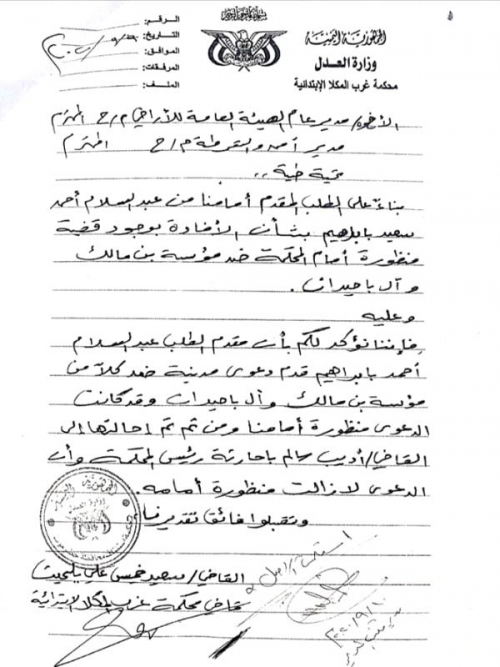 ومن جانبه أكد القاضي سعيد خميس علي بلبحيث،قاضي محكمة غرب المكلا الابتدائية في مذكرة صادرة عنه بتاريخ 10 - 9 - 2020 موجهة إلى كل مدير عام الهيئة العامة للاراضي م / ح، ومدير أمن والشرطة م / ح، وجود قضية منظورة أمام المحكمة. وقال القاضي بلبحيث أنه وبناء على الطلب المقدم من"عبدالسلام أحمد سعيد بابراهيم (باداوؤد) بشأن الافادة بوجود قضية منظورة أمام المحكمة ضد مؤسسة بن مالك وآل باحيدان ..فإننا نؤكد لكم بأن مقدم الطلب عبدالسلام أحمد بابراهيم (باداوؤد) قدم دعوى مدنية ضد كلا من مؤسسة بن مالك وآل باحيدان وقد كانت الدعوى منظورة أمامنا ومن ثم تم احالتها الى القاضي اديب سالم باحارثة رئيس المحكمة وان الدعوى لازالت منظورة امامه"، وهو مايؤكد ارتكاب مدير مكتب رئاسة الجمهورية مخالفة قانونية جسيمة يحاسب عليها القانون باعتباره تجاوزا لصلاحياته الوظيفية المحددة وتدخلا فاضحا في مهام وشؤون القضاء كأعلى سلطة تنفيذية، واقحاما مثيرا لرئاسة الجمهورية في قضية منظورة أمام القضاء وجعلها مطية وحجة تبرير أمام هيئة أراضي الدولة في اتخاذ إجراءات مخالفة لسلطان القضاء في التورط، الاسبوع قبل الماضي، بهدم منزل المستثمر الحضرمي عبدالسلام أحمد بابراهيم باداؤود وإزالة سور أرضه المحيطة به بوحدةجوار2D1 شارع الستين أمام منصة المكلا، رغم امتلاكه لوثيقة انتفاع من النقابات العمالية ومحاضر استلام وعقود انتفاع في تلك الأرض وتراخيص بناء واستكماله لكل الإجراءات القانونية.