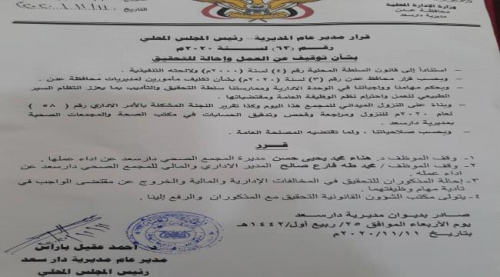 أصدر الدكتور أحمد عقيل باراس ، مدير عام مديرية دار سعد رئيس المجلس المحلي اليوم الأربعاء ، قراراً بإيقاف عدد من المسؤولين في القطاع الصحي بالمديرية عن العمل وإحالتهم للتحقيق .