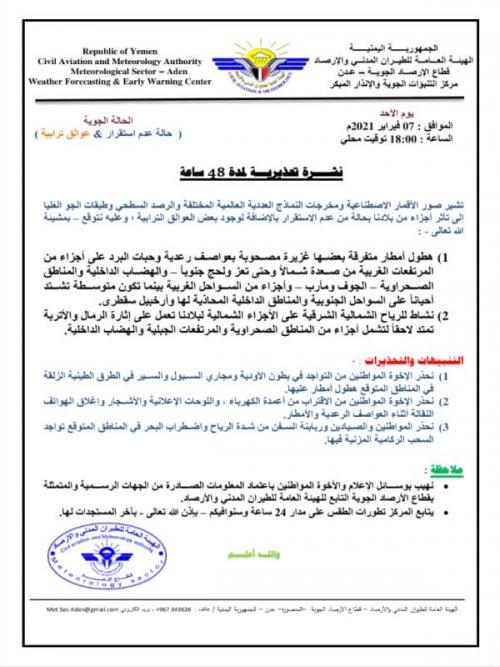 كما حذرت ايضا من تأثر الهضاب والمناطق الجبلية والصحراوية في مأرب والجوف وكذا ارخبيل سقطرى، بالاضافة الى اشتداد الرياح الشمالية الشرقية في المناطق الشمالية واثارة الاتربة والغبار مع تاثر الهضاب والجبال والصحراء.
