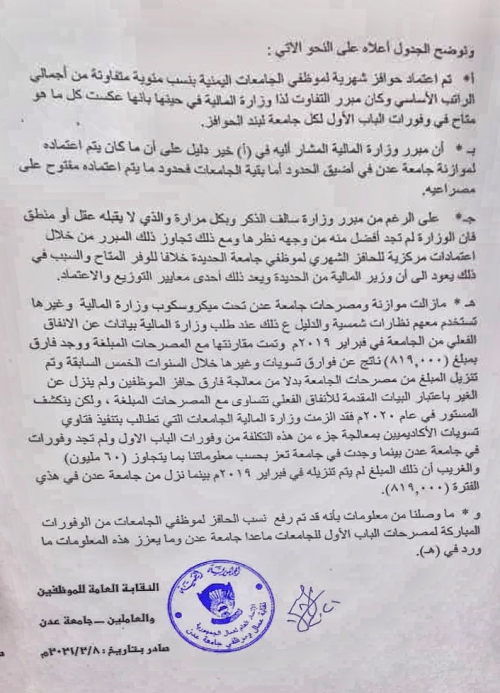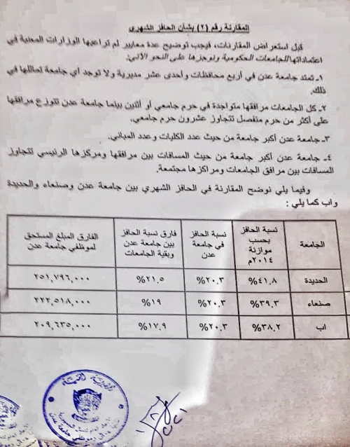 الجدير ذكره أن موظفين جامعتي صنعاء والحديدة وغيرهما من الجامعات الحكومية الأخرى يتحصلون على ضعف ما يتحصل عليه الموظفو جامعة عدن.