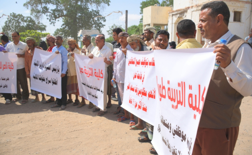 موظفو ومتعاقدو جامعة عدن يصعدون وقفتهم الإحتجاجية بمحافظة لحج وينددون بالبسط الممنهج على كليات الجامعة