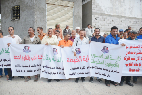 وحمل المحتجين اللافتات التي تطالب الحكومة بالإفراج عن حقوقهم المشروعة والاستجابة لمطالبهم في الحصول على كل المستحقات وطالبوا بإنصاف موظفي جامعة عدن وكذلك المتعاقدين البالغ عددهم من( 990) متعاقد ومتعاقدة الذين لا تتجاوز رواتبهم التعاقدية ما بين( 6 الف الى 8) الف وطالبوا بإعادة النظر في ميزانية الجامعة وتوظيف جميع المتعاقدين وإنصاف موظفي الجامعة لدرجاتهم وحقوقهم و علاوتهم .