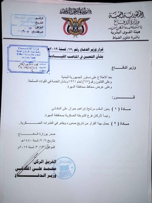 اصدر وزير الدفاع اليمني محمد علي المقدشي مطلع الٱسبوع الجاري قرارا رقم ١٧ لعام ٢٠١٩م قضى بتعيين احد اقربائه رئيساً لاركان الشرطة العسكرية بفرع المهرة دون ان يكون عسكريا ويحمل رتبه مزورة ويعمل بحسب مصادر بائع قات وليس من منتسبي وزارة الدفاع وفيما يلي نص القرار الذي حصلنا على صورة منه :