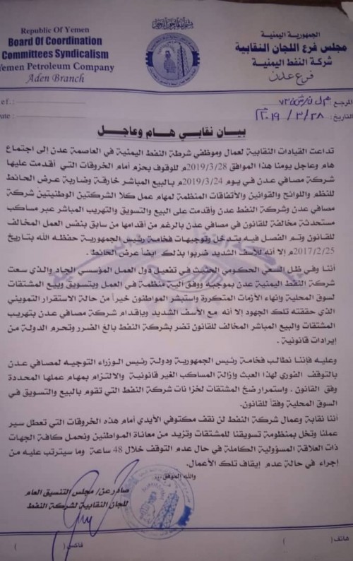 واكدت القيادات النقابية في بيانها ان اقدام مصافي عدن على تهريب المشتقات النفطية والبيع المباشر لها بشكل مخالف للقانون يضر بشركة النفط بالغ الضرر ويحرم الدولة من ايرادات قانونية.