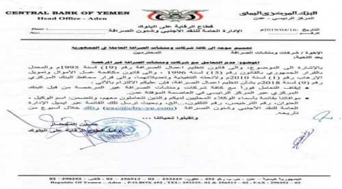 أصدر البنك المركزي اليمني بالعاصمة عدن تعميما الى كافة شركات الصرافة.