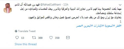 وقال أحد أفراد الأسرة القطرية الحاكمة، فى تغريدة له عبر حسابه الشخصى على "تويتر"، موجها رسالته إلى أمير قطر: "مهما بلغت الخصومة بيننا فهى لا تبرر تجاوزاتك الدينية والعرقية ولا تبرر بيعك للمقدسات وللمباديء من أجل استدامة سلطتك ومصالحك".