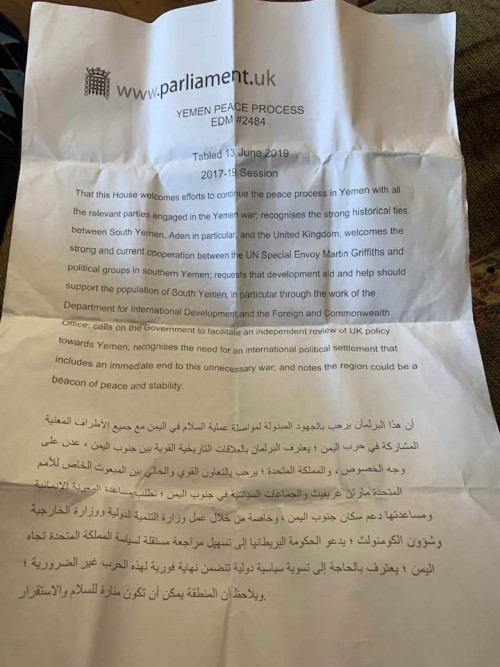 حيث رحب مشروع البرلمان البريطاني بالجهود المبذولة لمواصلة عملية السلام في اليمن مع جميع الأطراف المعنية والمشاركة في حرب اليمن.