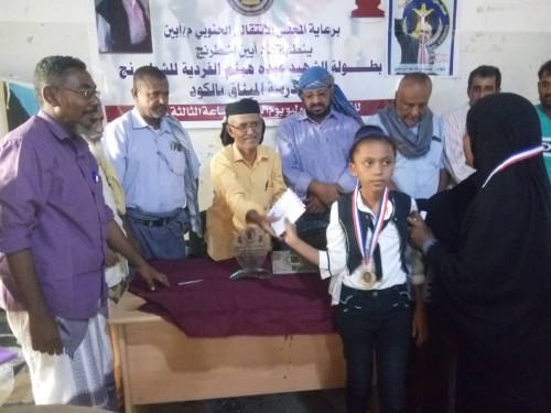 من جانبه قدم رئيس اتحاد الشطرنج بالمحافظة علاء باحكر ترس تذكاري لقيادة المجلس الانتقالي الجنوبي بالمحافظة على دعمه ورعايته لبطولة الشهيد عبده هيثم الشطرنجية.