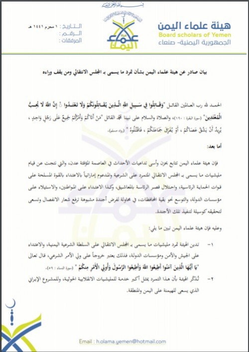 جائت الفتوى التكفيرية الجديدة في بيان صادرعن هيئة علماء حزب الاصلاح ( فرع تنظيم الاخوان المسلمين اليمنيين) المسماه ( هيئة علماء اليمن) صدر عنها اليوم 1 محرم 1440 الموافق 31 اغسطس 2019.
