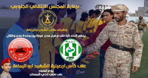 أعلن الأخ مؤمن حسن السقاف، رئيس دائرة الشباب والرياضة بالأمانة العامة لهيئة رئاسة المجلس الانتقالي الجنوبي، عن إقامة مباراة بين قطبي الكرة الجنوبية فريقي التلال ووحدة عدن بمناسبة أربعينية شهيد الوطن، قائد اللواء الأول دعم وإسناد القائد منير اليافعي "ابو اليمامة".