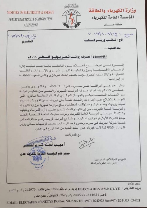 ايضا أطلاع منتسبين ونقابات كهرباء عدن بما تتعرض له من ضغوط تمارس عليها من جهات عليا لصرف مبالغ من ايرادات كهرباء عدن خارج اطار مسؤولية كهرباء عدن ومرافقها بمناطقها الثلاث ومحطاتها الثلاث وادارتها العامة فقط وما دون ذلك يعتبر خرق للقرار الجمهوري بأستقلالية المؤسسة العامة للكهرباء م/عدن ماليا وادريا ومخالف لذلك وسيقف الجميع امامه مهما كانت سلطته واخيرا نعيد تكرار ما طالب به المكتب التنفيذي لنقابات كهرباء عدن في بيانه مرجع ن ك ع /٢٠١٩/١ بتاريخ ٠٩/٠٩/٢٠١٩ ونعيد مطالبتنا لوزارة المالية بتوضيح اسباب عدم صرف رواتب كهرباء عدن لشهري يوليو واغسطس رغم صرفها لباقي مرافق الدولة وخاصة فروع المؤسسة العامة للكهرباء في باقي المحافظات رغم عدم وجود اي عمل لديهم في محطات انتاج الكهرباء وتوقف اغلب الاعمال لديهم بسبب ظروفهم في تلك المحافظات ومحافظة عدن تعمل بكامل طواقمها في المحطات والمناطق فعليهم توضيح اسباب عدم الصرف والموانع التي تسببت بايقاف صرف مرتبات كهرباء عدن وبشكل فوري.