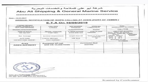 مرفق وثيقة من الوكيل الملاحي توضح حمولة السفينة عند وصولها إلى غاطس ميناء عدن .