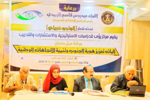 دشن مركز رؤى للدراسات الإستراتيجية و الإستشارات والتدريب، صباح اليوم الأربعاء، ورشة عمل حول "آليات تعزيز هوية الجنوب وتنمية الاتجاهات الوطنية"، برعاية المجلس الانتقالي الجنوبي .