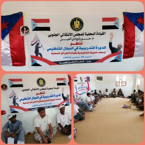 نظمت القيادة المحلية للمجلس الانتقالي الجنوبي مديرية حورة ووادي العين بمحافظة حضرموت ممثلة بالإدارة التنظيمية، اليوم السبت، دورة تدريبية في المجال التنظيمي لأعضاء الهيئة التنفيذية للقيادة المحلية للمجلس ورؤساء ونواب ورؤساء الإدارات التنظيمية بالمراكز المحلية التي تم إشهارها مؤخرا.