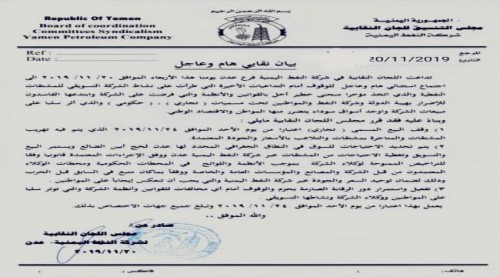 قرر مجلس اللجان النقابية لعمال وموظفي شركة النفط وقف البيع المسمى التجاري اعتبارا من يوم الاحد الموافق 24 نوفمبر 2019م والذي قال بانه يتم استغلاله لتهريب المشتقات النفطية والمتاجرة بها والتلاعب بأسعارها والجودة المفترض الاعتماد عليها .