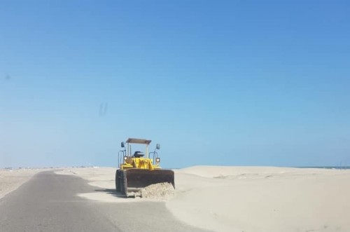 فرق الانتقالي تزيح الكثبان الرملية عن الطريق الدولي "عدن - أبين"