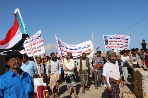 العشرات ينفذون وقفة احتجاجية أمام مقر التحالف ب#العاصمة_عدن