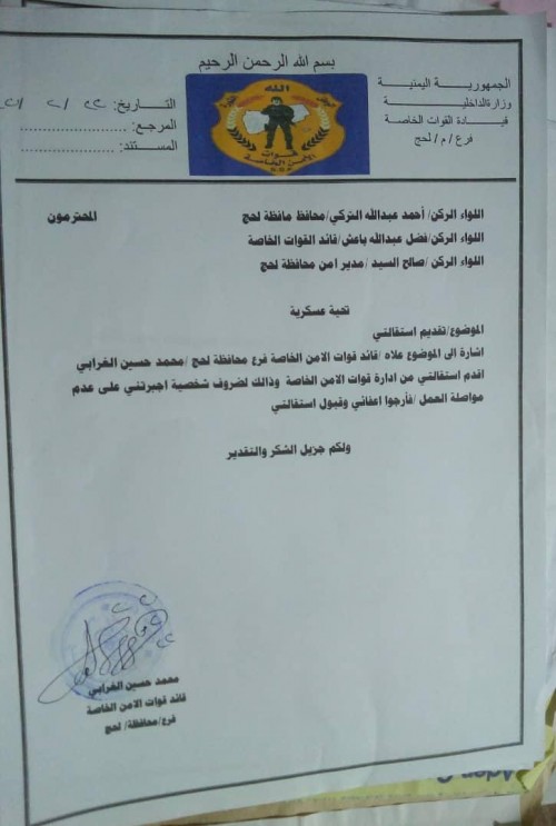 وكشفت وثيقة رسمية صادرة من قائد القوات الخاصة فرع محافظة لحج عن طلب موجه لكل من اللواء الركن احمد عبدالله تركي محافظ المحافظة واللواء الركن فضل عبدالله باعش قائد القوات الخاصة واللواء الركن صالح السيد مدير امن محافظة لحج لإعفائه وقبول استقالته.