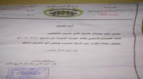 يعين الاخ / صدام حسين علي حسين الصالحي قائد للحزام الأمني قطاع مودية اعتبارا من تاريخ  2020/2/20م