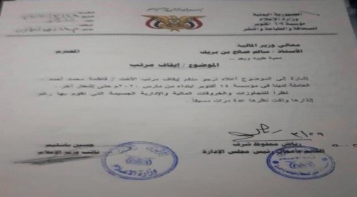 وحسب الوثيقة ، فقد وجه كلا من محفوظ شرف القائم بأعمال رئيس مجلس الإدارة، وحسين باسليم، نائب وزير الإعلام، بإيقاف مرتب مديرة الحسابات في المؤسسة فاطمة محمد أحمد، ابتداء من شهر مارس، حتى إشعار آخر.