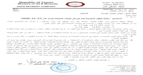 وبحسب وثيقة موجهة من المصافي الى دولة رئيس الوزراء الدكتور معين عبدالملك بتاريخ 27 ديسمبر لفتت فيها الى ان مخزون الديزل الخاص بمحطات الكهرباء يكفي لمدة 12 يوم وتدعو للتدخل العاجل بشراء شحنة اسعافية عاجلة من مخزون التجار الموجود في خزنات المصافي لتغطية الاحتياج تفاديا من حدوث ازمة في وقود الكهرباء.