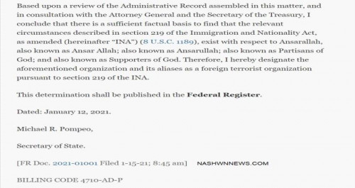 وأكد نص الإشعار الرسمي الصادر عن وزير الخارجية الأمريكي مايك بومبيو، اليوم، أنه وبعد مراجعة السجل الإدارة وبالتشاور مع المدعي العام ووزير الخزانة، يتم تعيين المنظمة المعروفة باسم أنصار الله كمنظمة إرهابية أجنبية وفقاً للمادة 219 من قانون الهجرة والجنسية.