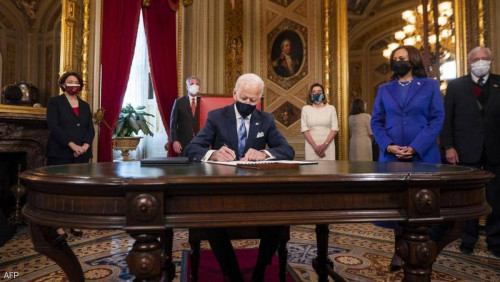 كما هو معتاد بعد أداء اليمين، وقع الرئيس الأميركي جو بايدن ثلاث وثائق أثناء وجوده في غرفة الرئيس في مبنى الكابيتول.