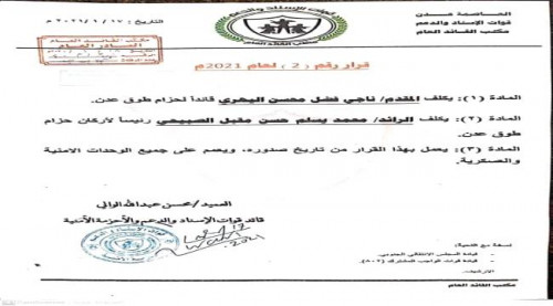 فيما نصت مادته الثانية على تعيين الرائد محمد يسلم الصبيحي رئيسا لاركان حزام طوق عدن.