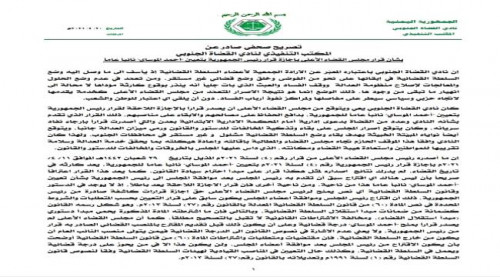أصدر المكتب التنفيذي لنادي القضاة الجنوبي بيان صحفي بشأن قرار مجلس القضاء الأعلى بإجازة قرار رئيس الجمهورية بتعيين "أحمد الموساي" نائباً عاماً.
