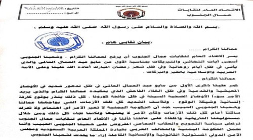 أصدر اتحاد نقابات عمال الجنوب بيان هام تناول كافة الانتهاكات التي تمارس على شعب الجنوب والعقاب الجماعي المنفذ من قبل الحكومة اليمنية والذي يقابله صمت دول التحالف ومجلس الامن.