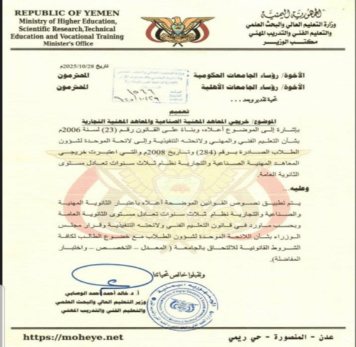 أصدر معالي وزير التعليم العالي والبحث العلمي والتعليم الفني والتدريب المهني الدكتور /خالد احمد الوصابي تعميمآ ذات مرجع 1566 تاريخ 2025/10/29 بخصوص (اعتبار الثانوية المهنية الصناعية والتجارية نظام ثلاث سنوات تعادل مستوى الثانوية العامة.