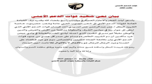 أعلنت قوات الدعم الأمني في النخبة الحضرمية، اليوم الجمعة، استشهاد البطل عمر عبد الرحمن عمر العمودي أحد فرسان قوات الدعم الأمني الذي ارتقى في ميادين الشرف والبطولة.