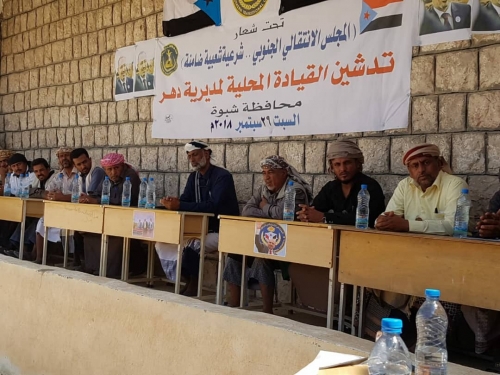 برعاية اللواء عيدروس قاسم الزُبيدي رئيس المجلس الانتقالي الجنوبي، اختتمت القيادة المحلية للمجلس الانتقالي الجنوبي في محافظة شبوة، السبت، إشهار القيادات المحلية للمجلس في مديريات المحافظة، بتدشين القيادة المحلية للمجلس الانتقالي في مديرية دهر.
