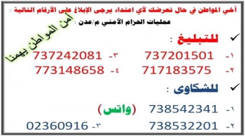 نشرت قيادة الحزام الامني بعدن مساء يوم الثلاثاء قائمة ارقام هواتف لاستقبال أي شكوى أو أي بلاغ عن وقوع جريمة أو عملية تقطع.