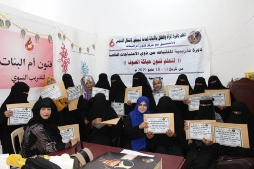 اختتمت دائرة المرأة والطفل بالأمانة العامة لهيئة رئاسة المجلس الانتقالي الجنوبي، مساء السبت، الدورة التدريبية لفتيات من ذوي الاحتياجات الخاصة، التي نظمتها بالتنسيق مع مركز فنون أم البنات التدريب النسوي، تحت عنوان "تعلم فنون حياكة الصوف".