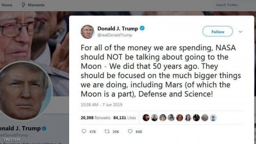 ففي تغريدة جاءت تعقيبا على سياسة إدارته المتعلقة بالفضاء طلب دونالد ترامب من ناسا أن تركز على المريخ "الذي يشكل القمر جزءا منه" عوضا عن الذهاب إلى القمر، وقال "فيما يتعلق بكل الأموال التي ننفقها، ينبغي على ناسا ألا تتحدث عن الذهاب إلى القمر.. لقد فعلنا ذلك قبل 50 عاما".