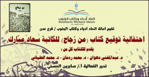 يقيم اتحاد أدباء وكتاب الجنوب فرع العاصمة الجنوبية عدن عصر غدًا الاثنين 1 يوليو / تموز 2019م احتفالية لتوقيع كتاب "من زجاج" للكاتبة سعاد مبارك في مقر الاتحاد الكائن بمديرية خورمكسر في عدن.