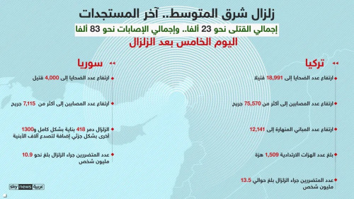 فيما تتضاءل الآمال بالعثور على ناجين تحت الأنقاض وركام المباني المهدمة في اليوم الخامس بعد زلزال شرق المتوسط، ارتفعت حصيلة الضحايا في كل من تركيا وسوريا وبلغت 23 ألف قتيل ونحو 83 ألف جريح وفق التقارير الصادرة حتى مساء الجمعة.
